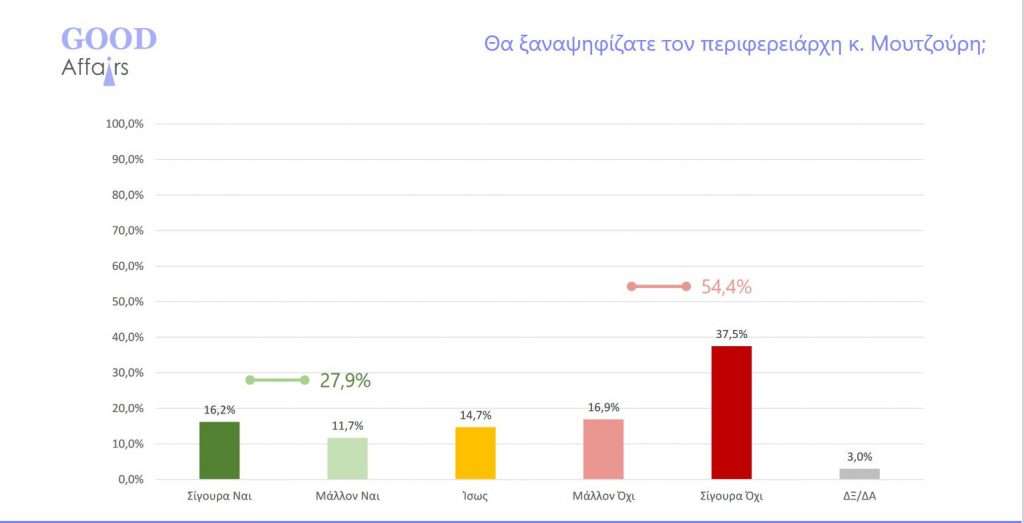 - Πάνω από τους μισούς ερωτώμενους στην έρευνα (ποσοστό 54,4%) λέει μάλλον ή σίγουρα ότι δεν θα ξαναψήφιζε τον κ. Μουτζούρη ενώ 27,9% ότι θα ψήφιζε σίγουρα ή μάλλον.