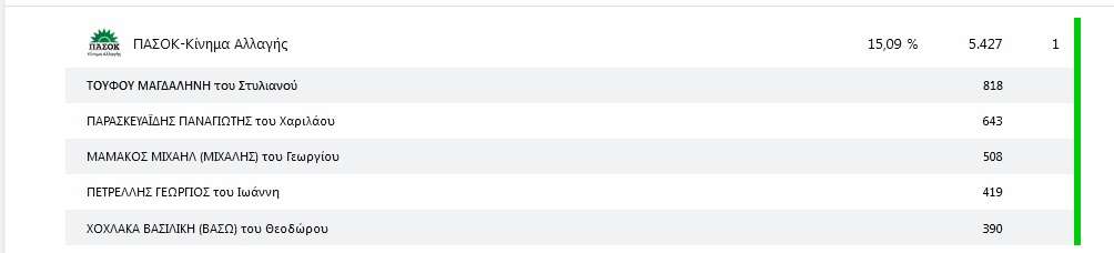 Όπως δείχνει η ενσωμάτωση στο 40,60% η υποψήφια Βουλευτής του ΠΑΣΟΚ ΚΙΝΗΜΑ ΑΛΛΑΓΗΣ κ. Τούφου από τη Λήμνο είναι πρώτη στην Ενσωμάτωση σταυρών με 818 ψήφους