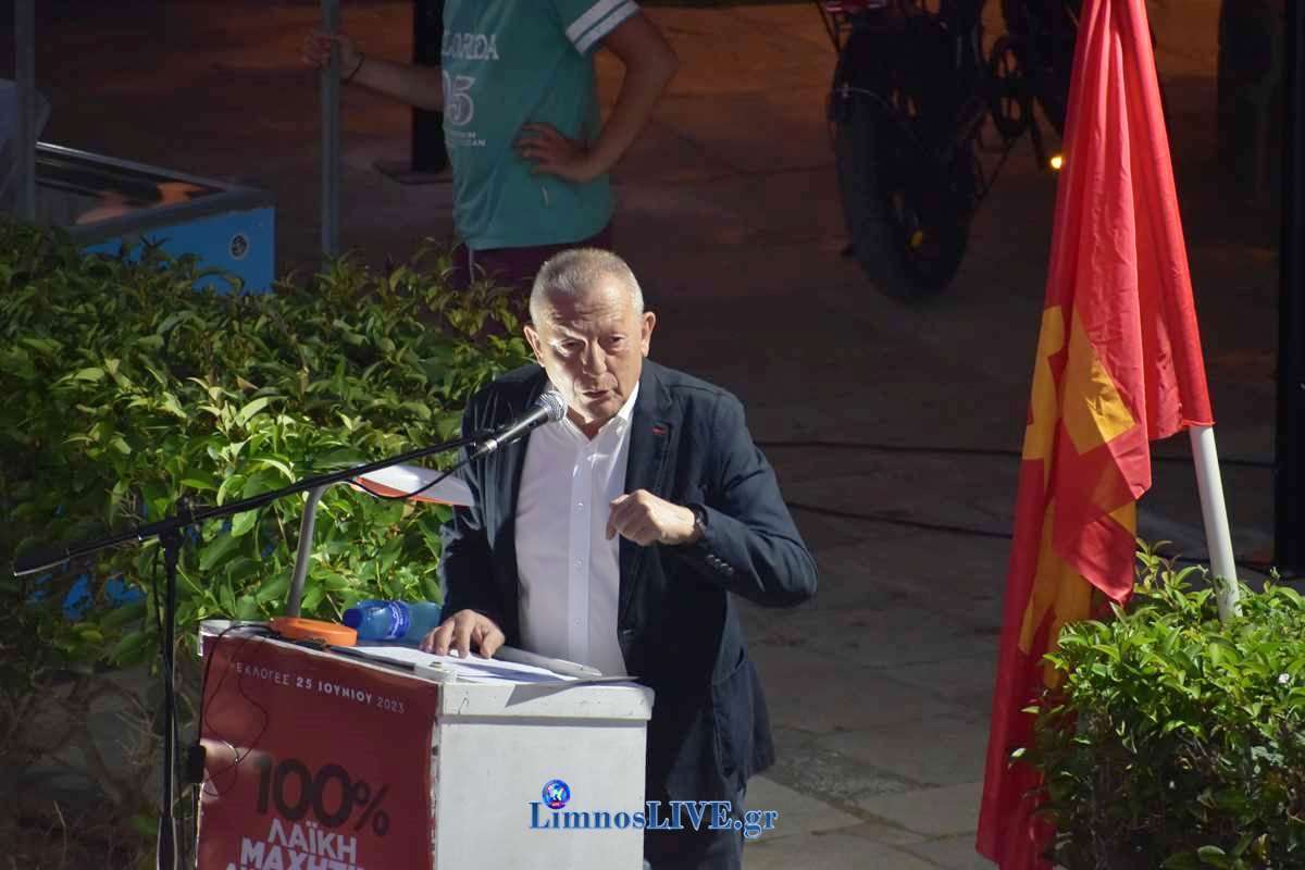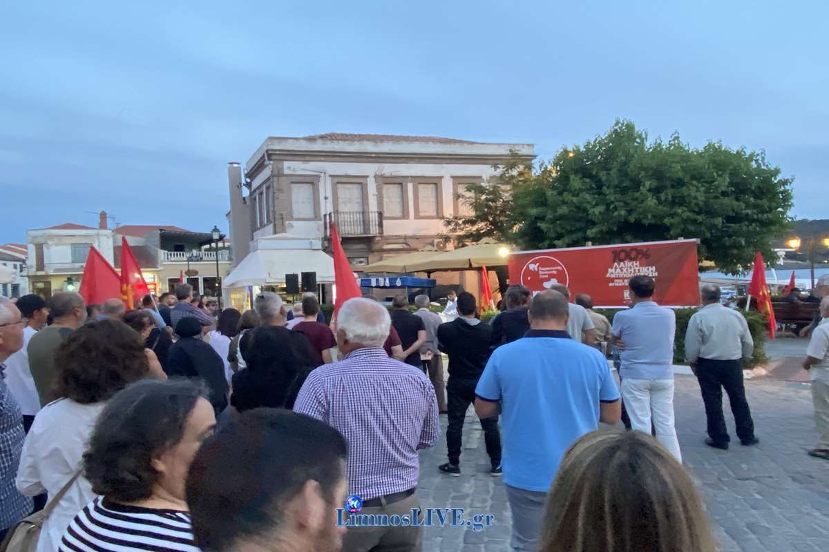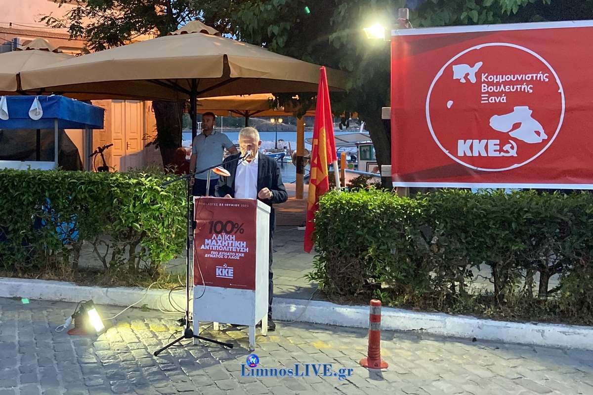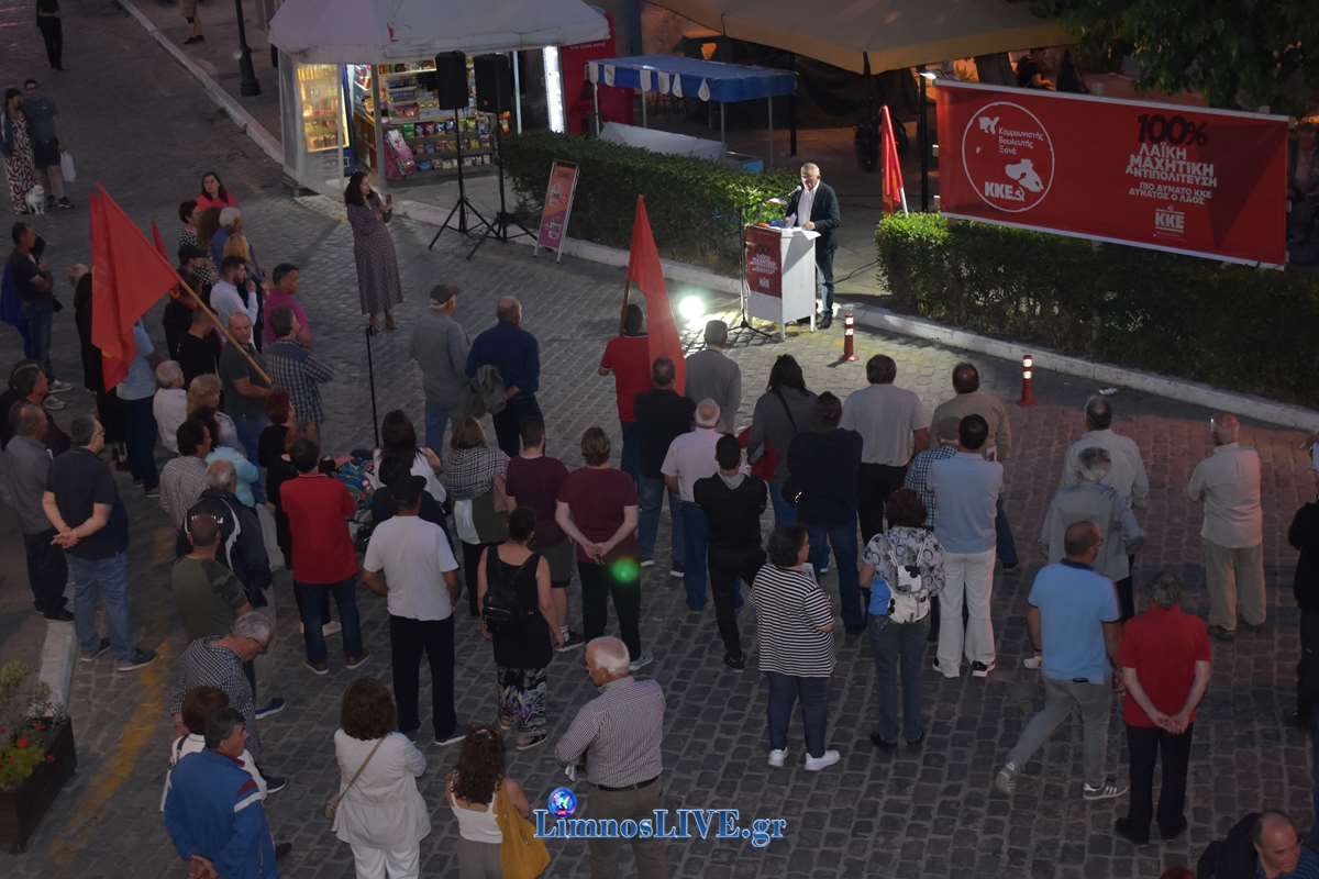 Στην συγκέντρωση χαιρέτησε ο υποψήφιος βουλευτής στο νομό από τη Λήμνο, Σπύρος Πλάντζος και αμέσως μετά πήρε τον λόγο ο ο Θανάσης Παφίλης, επικεφαλής του ψηφοδελτίου επικρατείας του ΚΚΕ και μέλος της Κεντρικής Επιτροπής του ΚΚΕ
