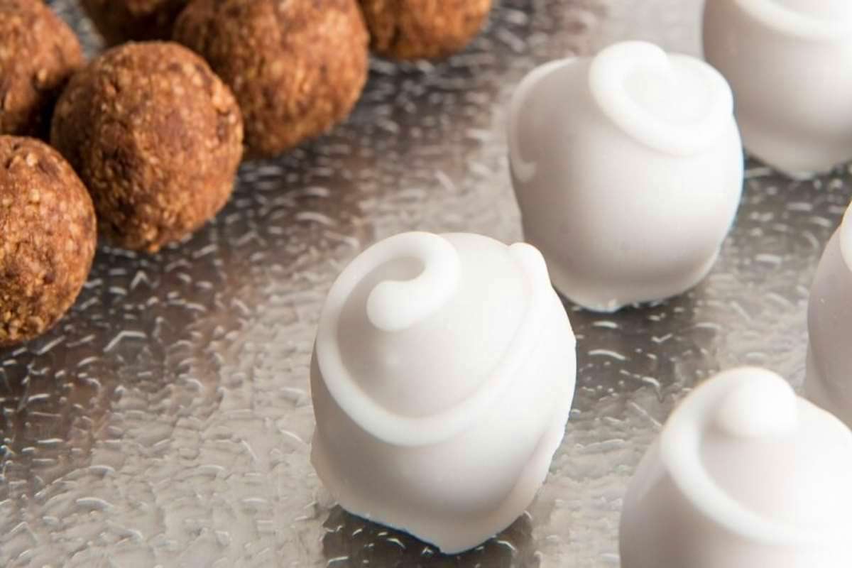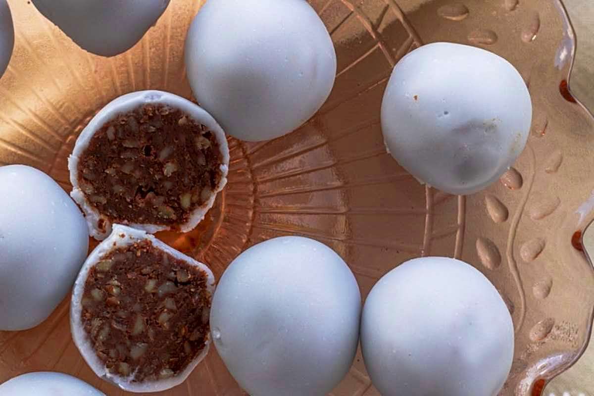 Ξανά ανακατεύουμε πολύ καλά όλα μαζί τα υλικά, και αφού βρέξουμε τα χέρια μας με μπόλικο κονιάκ, πλάθουμε το μείγμα σε μικρά σφαιρικά σοκολατάκια (μπαλίτσες) που αφήνουμε για 24 ώρες σε δροσερό μέρος, για να στεγνώσουν καλά και να σφίξουν.