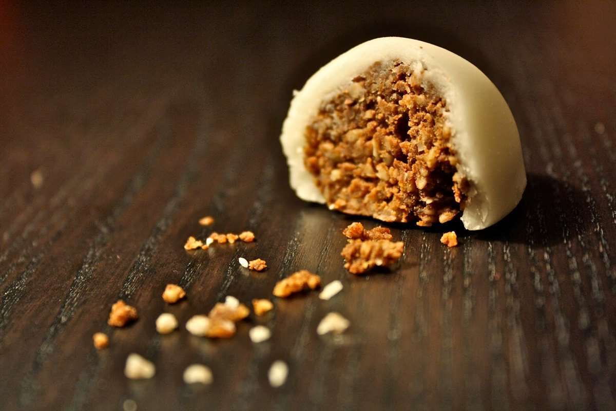 Τα αδειάζουμε σε ένα δοχείο και προσθέτουμε την καλοαλεσμένη κουβερτούρα μας. Ανακατεύουμε πολύ καλά τα υλικά μας, και έπειτα προσθέτουμε το λικέρ. Τελευταίο ρίχνουμε όσο σιρόπι χρειάζεται για να δέσει η μάζα των υλικών μας.
