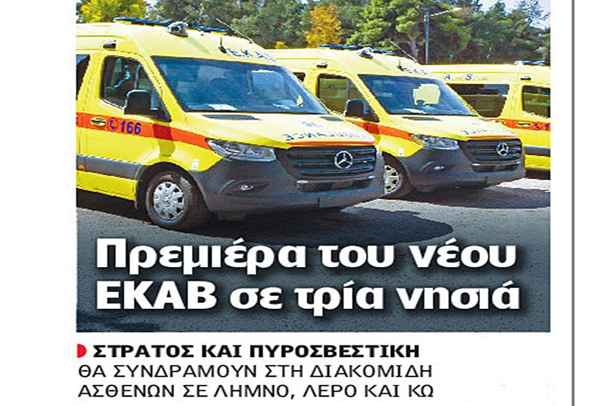 Με πρεμιέρα του νέου ΕΚΑΒ σύμφωνα με το σημερινό πρωτοσέλιδο της Realnews να γίνεται σε τρία νησιά. Στρατός και Πυροσβεστική θα συνδράμουν στη διακομιδή ασθενών σε Λήμνο, Λέρο και Κω.