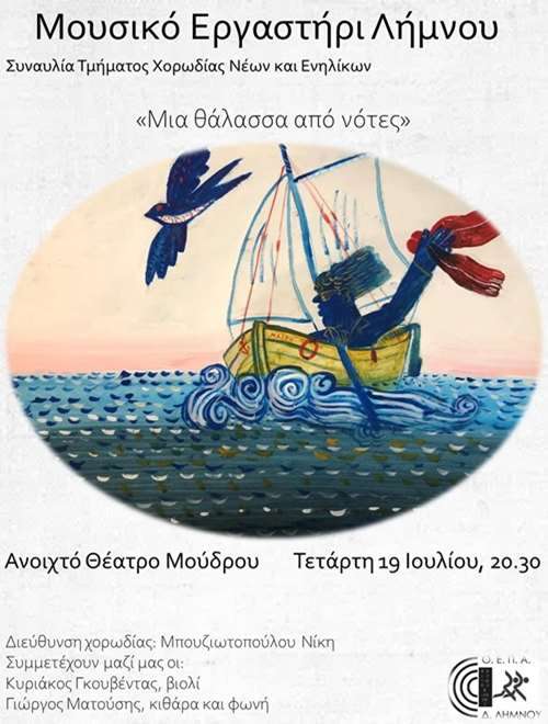 Το Μουσικό Εργαστήρι Λήμνου, παρουσιάζει το τμήμα Χορωδίας του, Νέων και Ενηλίκων, σε μία συναυλία, με τίτλο «Μια θάλασσα από νότες». Στο Ανοιχτό Θέατρο Μούδρου, μπροστά στη θάλασσα, την Τετάρτη 19 Ιουλίου και ώρα 20.30