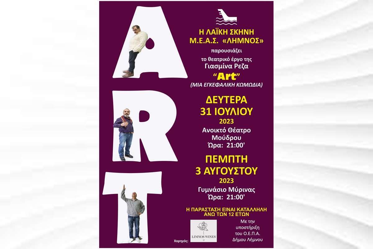 Η Λαϊκή Σκηνή του ΜΕΑΣ Λήμνος παρουσιάζει το θεατρικό έργο «ART», μια εγκεφαλική κωμωδία, της συγγραφέως Γιασμίνα Ρεζά.