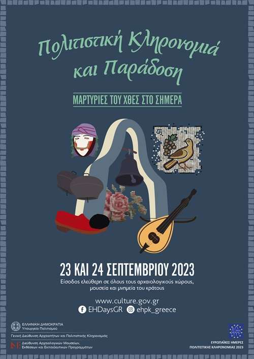 Η Ελλάδα, φέτος όπως και κάθε χρόνο, υιοθετεί το κοινό πανευρωπαϊκό θέμα εορτασμού των ΕΗΠΚ, European Heritage Days 2023: Living Heritage, με τον τίτλο «Πολιτιστική Κληρονομιά και Παράδοση: Μαρτυρίες του χθες στο σήμερα» (Δείτε σχετικά τον σύνδεσμο