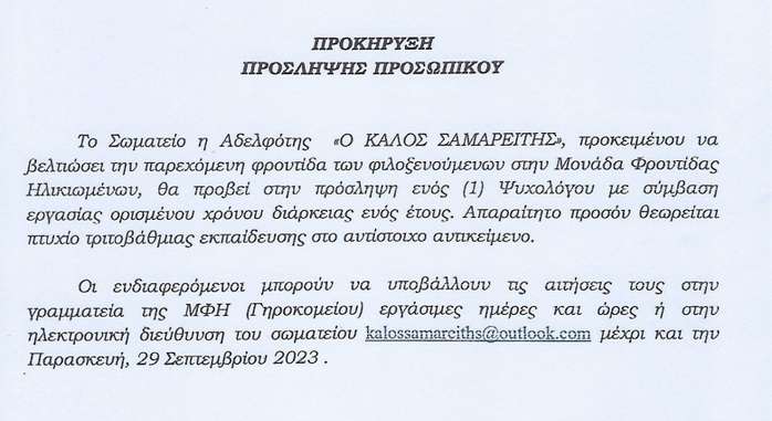Με σύμβαση εργασίας ενός έτους το σωματείο η αδελφότης “Ο ΚΑΛΟΣ ΣΑΜΑΡΕΙΤΗΣ” θέλει να προβεί στην πρόληψη ενός Ψυχολόγου