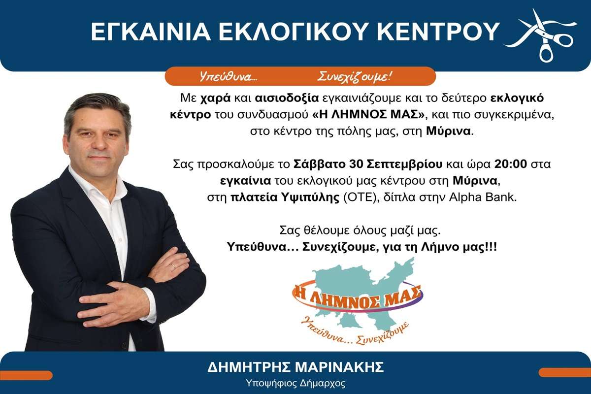 Μεθαύριο Σάββατο στις 20:00 θα πραγματοποιήσει τα εγκαίνια του δεύτερου εκλογικού κέντρου του “Η Λήμνος μας” του Δημήτρη Μαρινάκη