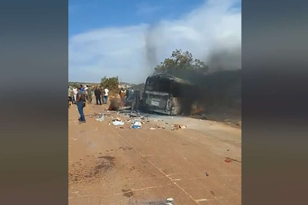 Σε βίντεο που αναρτήθηκε στα social media, φέρεται να απεικονίζεται το λεωφορείο στο οποίο επέβαιναν τα στελέχη της ελληνικής αποστολής να έχει παραδοθεί στις φλόγες.