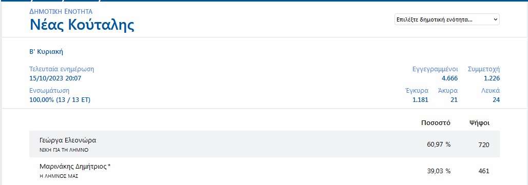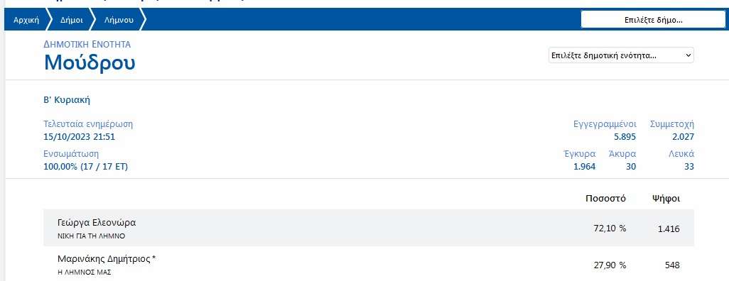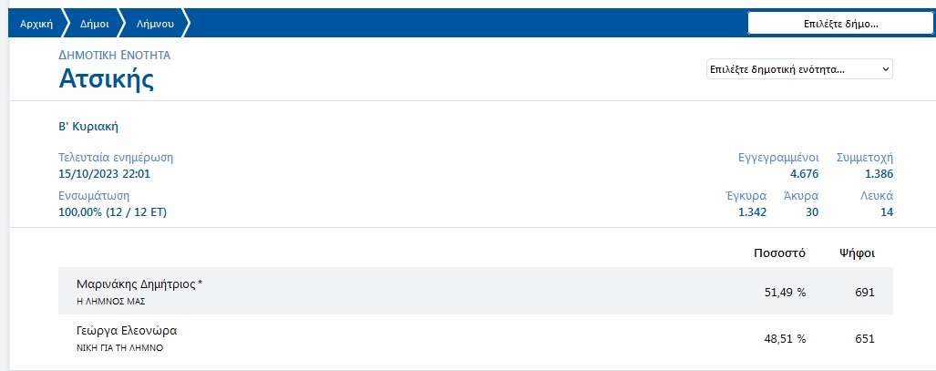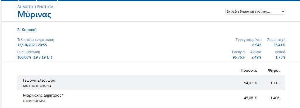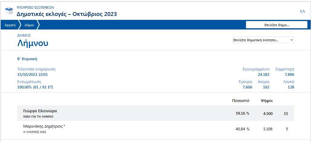 Η νέα δήμαρχος κα Ελεονώρα Γεώργα συγκέντρωσε 4.500 ψήφους ενώ ο νυν και απερχόμενος Δήμαρχος Λήμνου κος Δημήτρης Μαρινάκης συγκέντρωσε 3.106 ψήφους