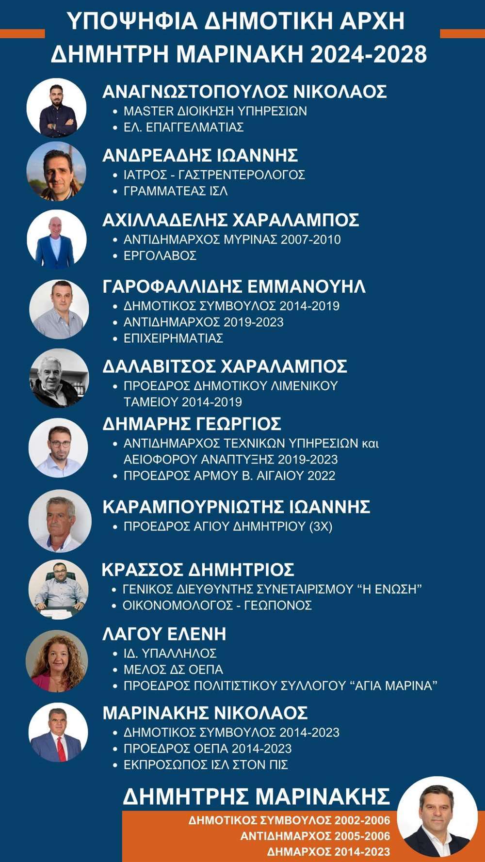 Ο Υποψήφιος Δήμαρχος Μαρινάκης Δημήτρης επέλεξε να στείλει το δικό του μήνυμα πριν ανοίξουν οι κάλπες παρουσιάζοντας ενδεικτικά την ομάδα του συνδυασμού «Η ΛΗΜΝΟΣ ΜΑΣ», η οποία πρόκειται να εκλεγεί εάν οι πολίτες τους τιμήσουμε με την ψήφο τους, αναφέροντας: