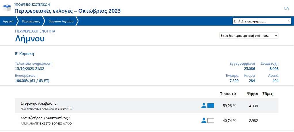 Η Λήμνος ψήφισε Στεφανή αλλά το Βόρειο Αιγαίο αλλιώς – Αποτελέσματα στο 100%