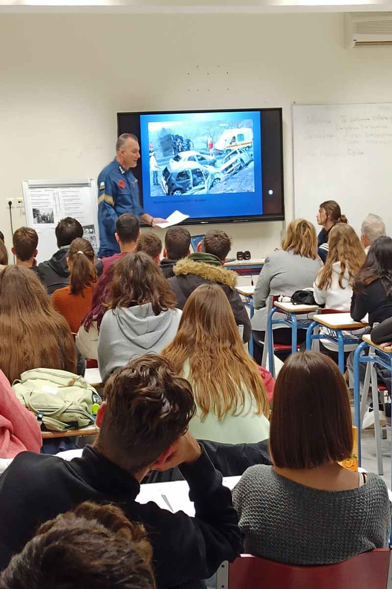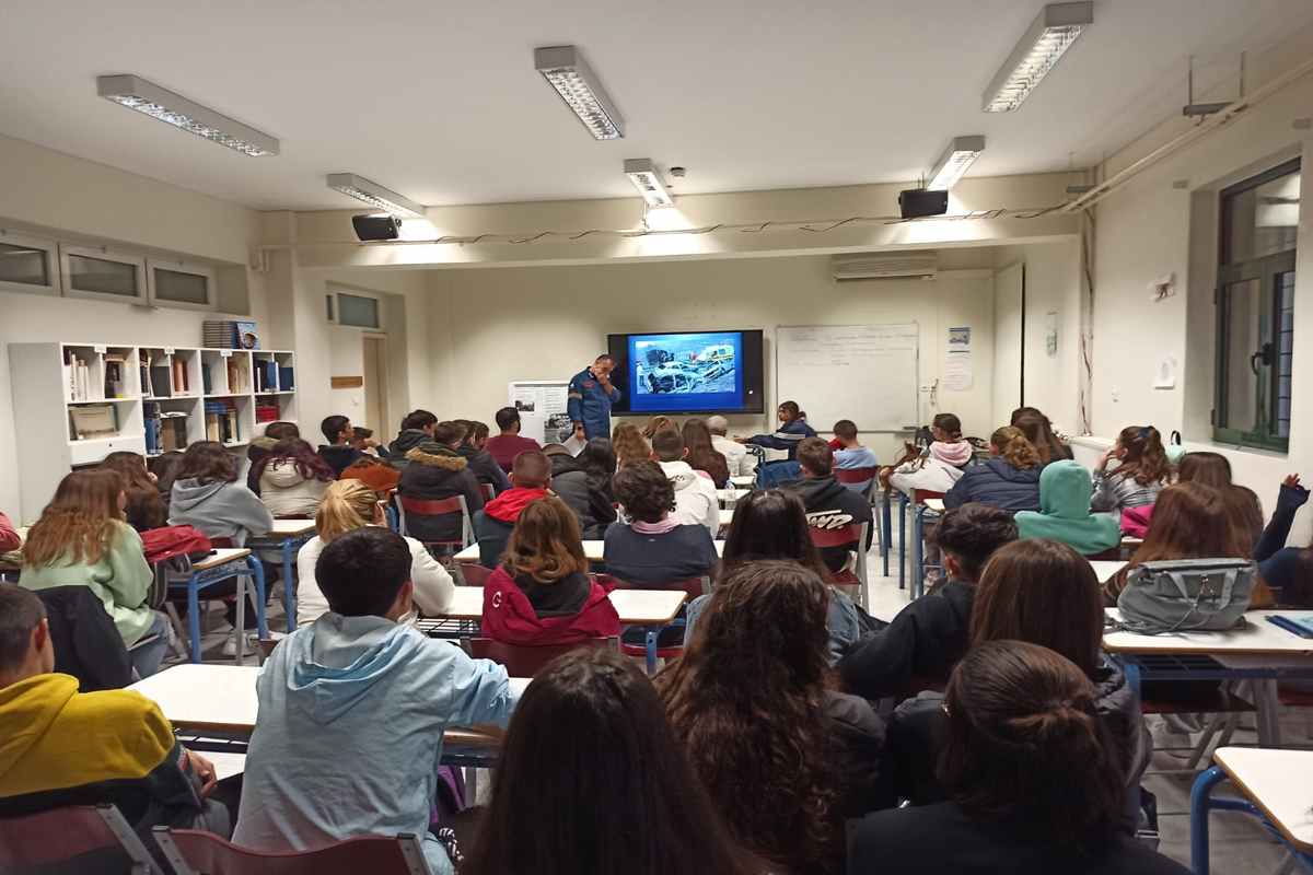 Η ενημέρωση έγινε από τον ανθυποπυραγό κ. Καβαλέρη Ιωάννη, ο οποίος με αμεσότητα και οικείο τρόπο μίλησε στους/στις μαθητές/τριες για πρόσφατες φυσικές καταστροφές και τους έδωσε οδηγίες, καθώς και τους ενημέρωσε για τον τρόπο συντονισμού και λειτουργίας-επέμβασης της Πυροσβεστικής. .