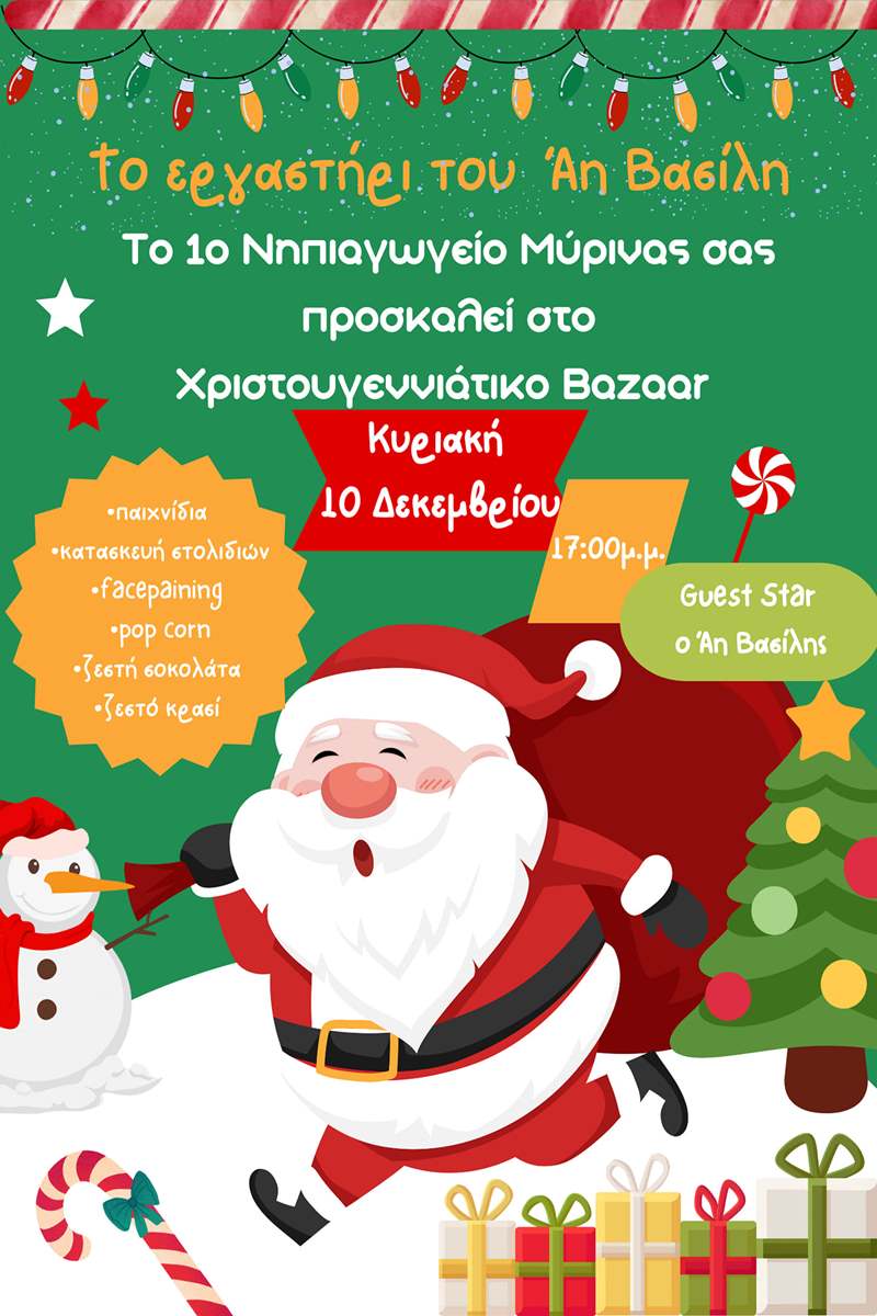 Το εργαστήρι του Άη Βασίλη έρχεται στο 1ο Νηπιαγωγείο Μύρινας και σας προσκαλούν στο Χριστουγεννιάτικο Bazzar που ετοιμάζουν!