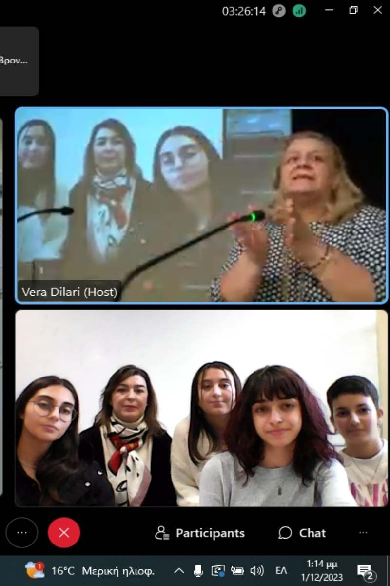 Κατά τη διαδικτυακή παρουσία του σχολείου στην Εκδήλωση, η εκπαιδευτικός Γαλλικής Γλώσσας Τσάκου Ευαγγελία και οι μαθήτριες Ταρσή Ειρήνη, Κωνσταντίνου Κυβέλη, Χαβιά Ασπασία και Κουκουλίθρα Ειρήνη, αναφέρθηκαν στην εμπειρία από τη συμμετοχή τους σε δύο Campus της Unesco (Campus “Series Acting for peace event” & Campus “Femmes pour la science”), καθώς και στα οφέλη που αποκομίζει το σχολείο από τις δράσεις του στο Δίκτυο ASPnet UNESCO. Ειδικότερα, μίλησαν για την ιδιαίτερη εμπειρία τους να μοιράζονται τις απόψεις και τους προβληματισμούς τους με μαθητές/τριες σχολείων από όλο τον κόσμο, να συνομιλούν με ειδικούς, να αντιλαμβάνονται ότι οι αγωνίες είναι κοινές, ότι όλοι είμαστε ίδιοι, βιώνουμε τις ίδιες επιπτώσεις και αγωνιούμε το ίδιο για το μέλλον αυτού του κόσμου, γελάμε με τον ίδιο τρόπο, συμμετέχουμε σε δράσεις με τον ίδιο τρόπο κι είμαστε μέλη μιας πολύ μεγάλης οικογένειας. Με τη συμμετοχή του σχολείου μας στις δράσεις του Δικτύου ASPnet UNESCO νιώθουμε ενεργά μέλη της παγκόσμιας κοινότητας και θεωρούμε ότι βάζουμε κι εμείς το λιθαράκι μας για έναν πιο ελπιδοφόρο αυριανό κόσμο.