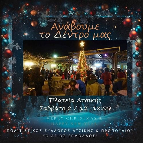 Ο Πολιτιστικός Σύλλογος Ατσικιωτών & Προπουλίου «Ο Άγιος Ερμόλαος» το Σάββατο 2 Δεκεμβρίου στις 18:00 φωταγωγήσει το Χριστουγεννιάτικο δέντρο στην πλατεία του χωριού δίνοντας το σήμα για την έναρξη των Χριστουγέννων!