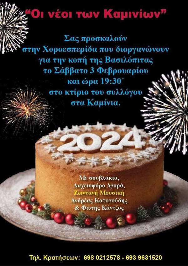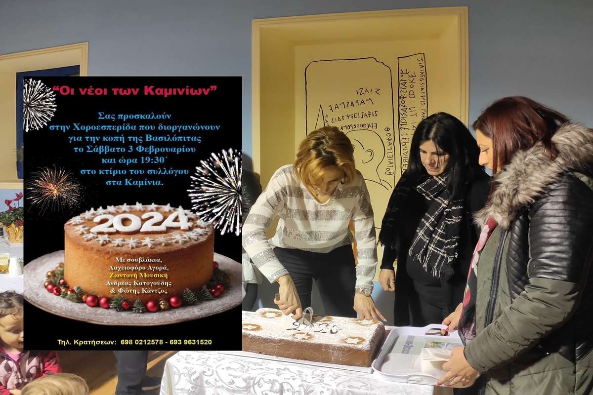 Οι νέοι των Καμινιών σας προσκαλούν στην Χοροσπερίδα που διοργανώνουν για την κοπή της Βασιλόπιτας το Σάββατο 3 Φεβρουαρίου και ώρα 19:30 στο κτίριο του συλλόγου