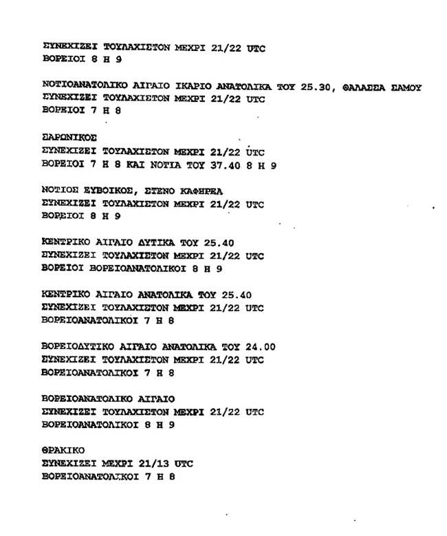 Β. Θυελλώδεις βόρειοι βορειοανατολικοί άνεμοι 8 και τοπικά 9 μποφόρ θα πνέουν σήμερα Κυριακή (21-01-24) σε ολόκληρο το Αιγαίο. Σταδιακά από το μεσημέρι της Δευτέρας (22-01-24) θα εξασθενήσουν στα 8 μποφόρ, αρχικά στα βόρεια και από τις βραδινές ώρες και στο υπόλοιπο Αιγαίο.
