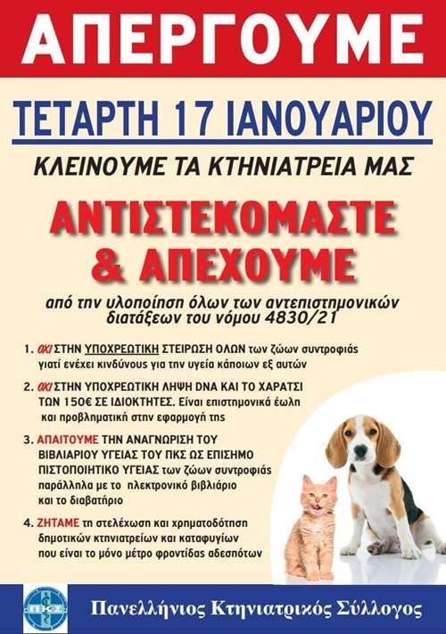 - Καλούμε σε πανελλαδική απεργία των κτηνιάτρων την Τετάρτη 17/1/24.