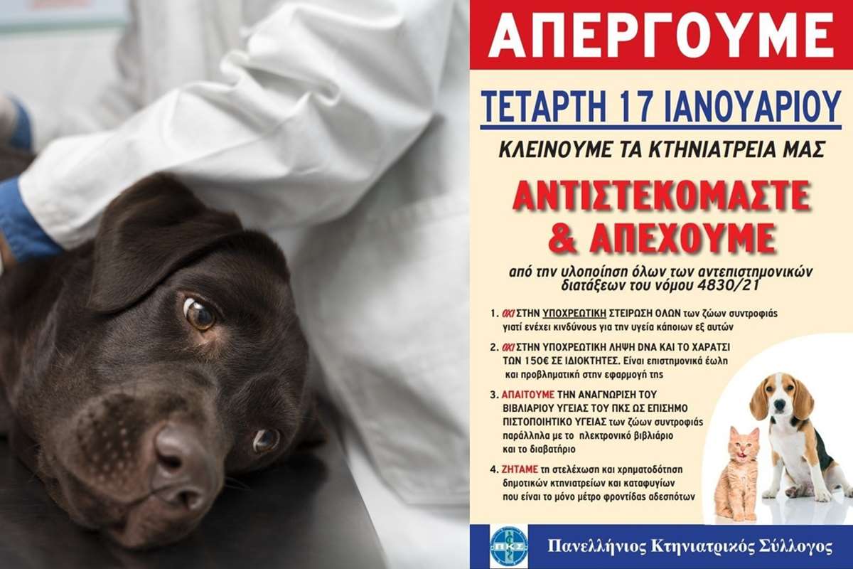 Σε πανελλαδική απεργία, την Τετάρτη, 17 Ιανουαρίου, απέναντι στο νέο νόμο για την ευζωία των ζώων συντροφιάς, καλεί τα μέλη του ο Πανελλήνιος Κτηνιατρικός Σύλλογος.