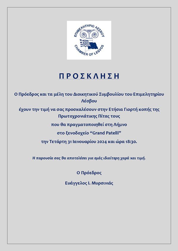 Το Επιμελητήριο Λέσβου κόβει την Πρωτοχρονιάτικη του πίτα στη Λήμνο και στο Grand Patelli την Τετάρτη 31 Ιανουαρίου στις 18:30