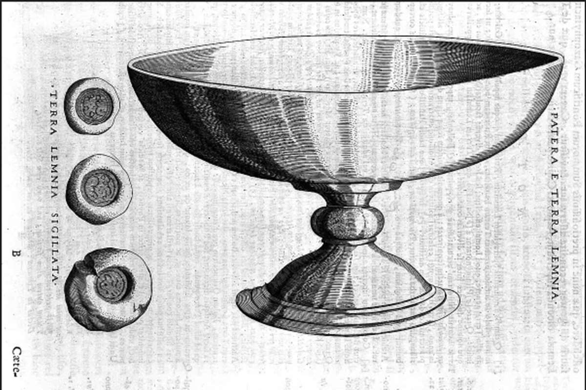 Γκραβούρα από το βιβλίο του Μισέλ Μερκάτι, Metallotheca. Opus posthumum, Ρώμη, 1719, που απεικονίζει αγγείο και δισκία “Λημνίας Γης” (“Terra Lemnia”). Πηγή: Wikimediamtx Commons.