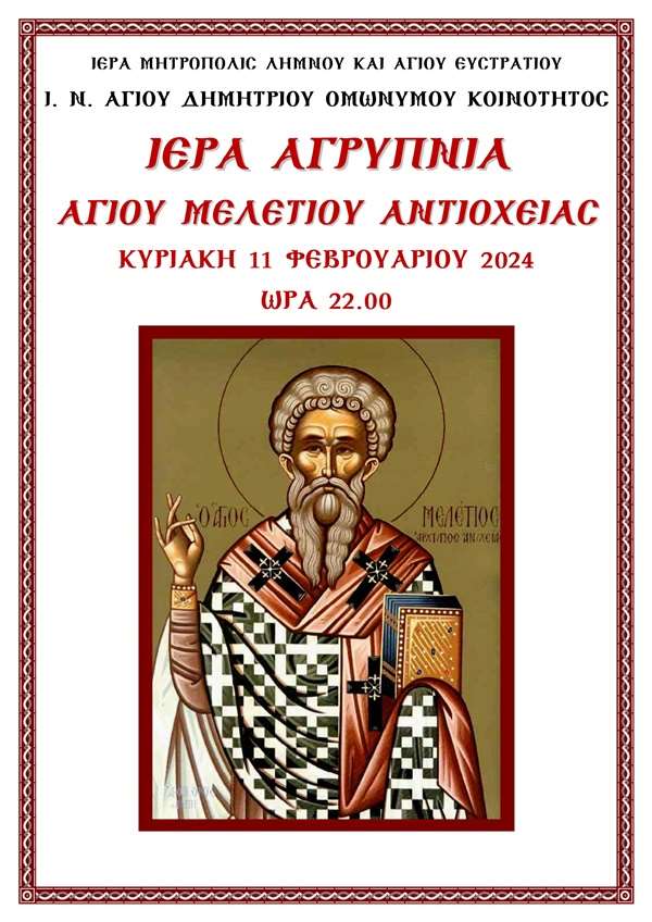 Ιερά Αγρυπνία επί τη μνήμη του Άγιου Μελέτιου Αρχιεπίσκοπος Αντιοχείας του οποίου τιμάται στις 12 Φεβρουαρίου θα πραγματοποιηθεί στον Ιερό Ναό Αγίου Δημητρίου της ομώνυμης Κοινότητας Αγίου Δημητρίου την Κυριακή 11 Φεβρουαρίου στις 22:00