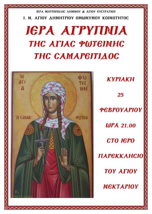 Λήμνος: Ιερά Αγρυπνία για την Αγία Φωτεινή την Σαμαρείτιδα