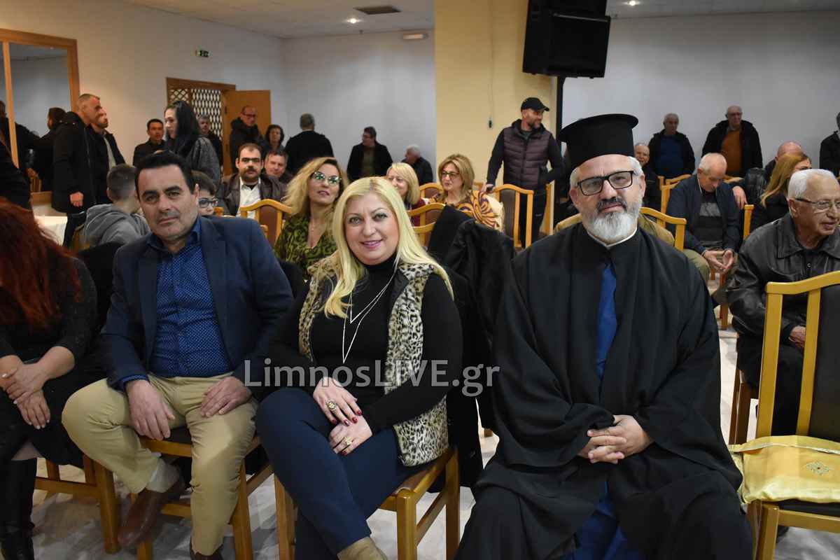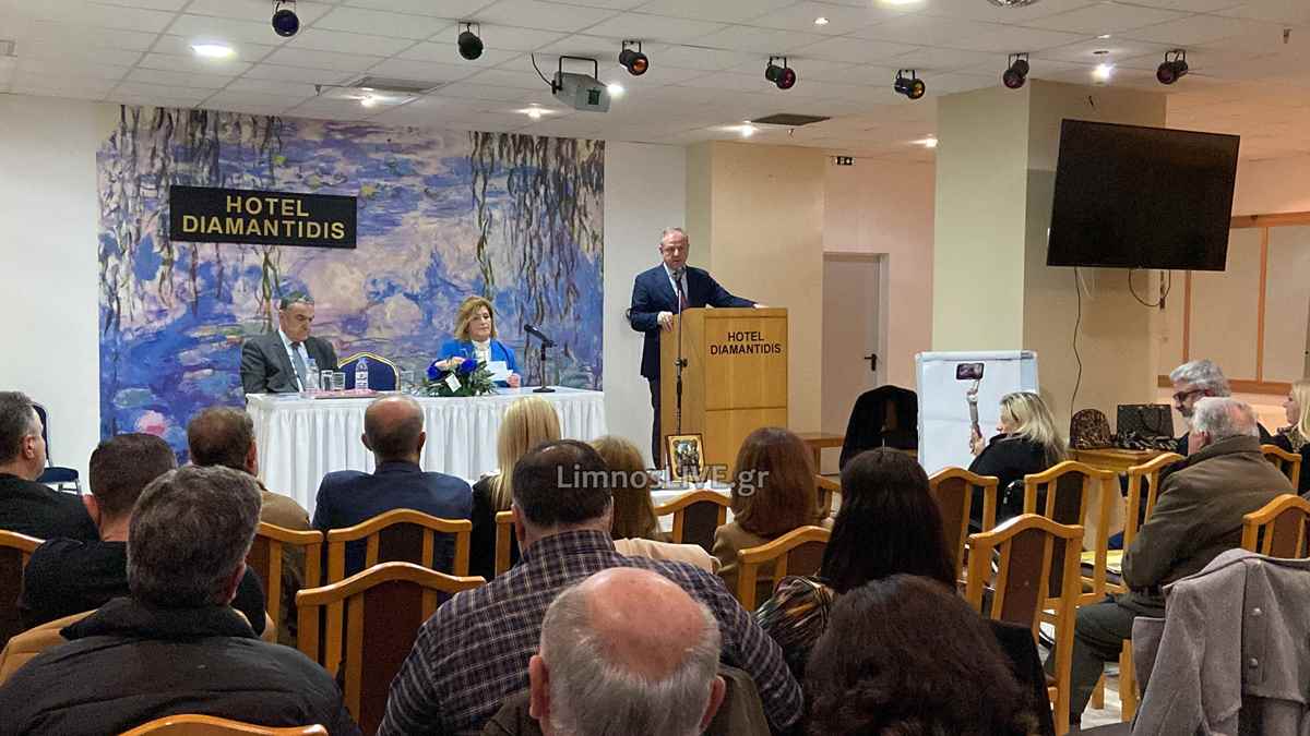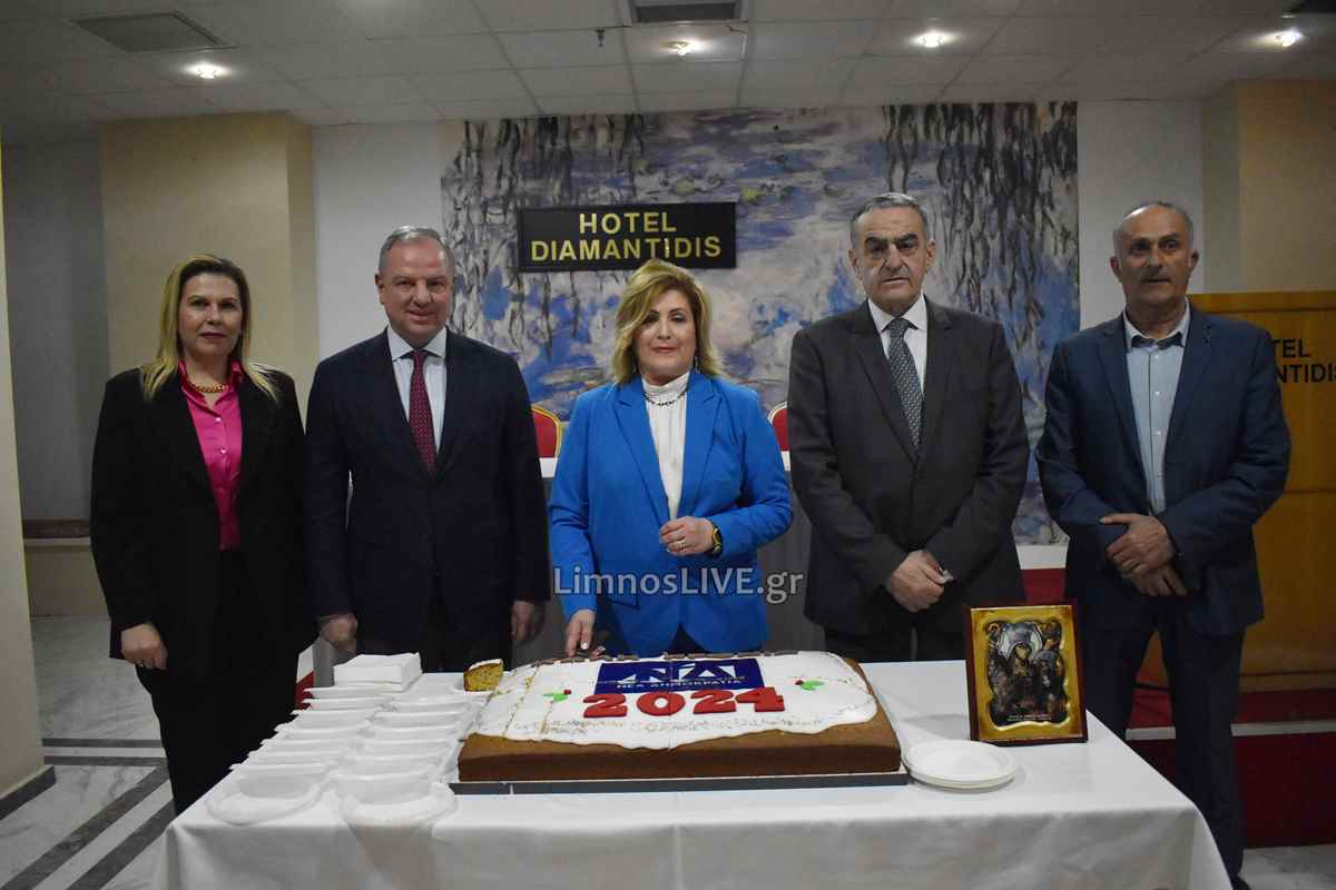 Χθες, Δευτέρα 19 Φεβρουαρίου, η Τοπική Οργάνωση της Νέας Δημοκρατίας στη Λήμνο διοργάνωσε την κοπή της Πρωτοχρονιάτικης Βασιλόπιτας της στο ξενοδοχείο Διαμαντίδη, με την παρουσία του Υφυπουργού Αγροτικής Ανάπτυξης, κ. Διονύσιου Σταμενίτη, του βουλευτή στο νομό Λέσβου, κ. Χαράλαμπου Αθανασίου, του Αντιπεριφερειάρχη σε θέματα Αγροτικής Ανάπτυξης, κ. Αγγέλου Βλάττα Λαμπρινού, της Δημάρχου Λήμνου, κας Ελεονώρας Γεώργας, δημοτικών συμβούλων και φίλων του κόμματος.