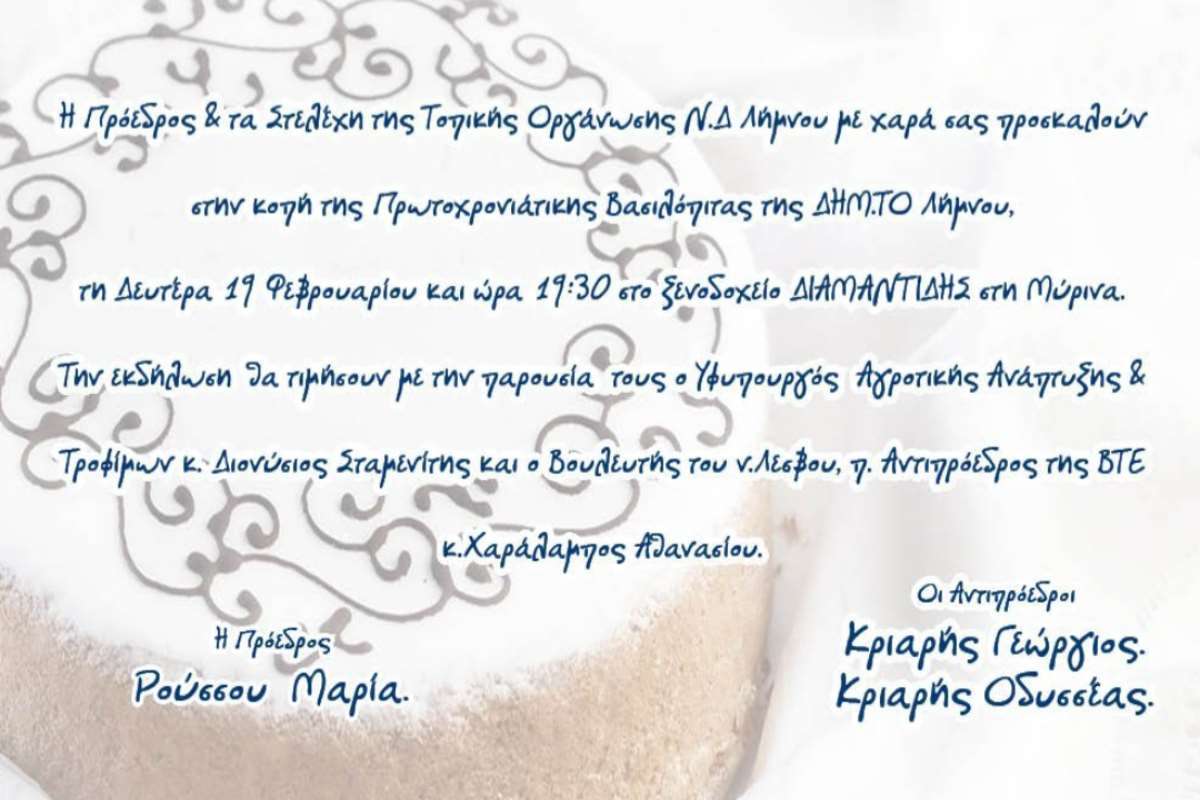 Η Πρόεδρος και τα Στελέχη της Τοπικής Οργάνωσης Ν.Δ. με χαρά σας προσκαλούν στην κοπή τη Πρωτοχρονιάτικης Βασιλόπιτας της ΔΗΜ.ΤΟ Λήμνου τη Δευτέρα 19 Φεβρουάριου και ώρα 19:30 στο Ξενοδοχείο Διαμαντίδης