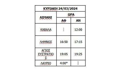 H AEGEAN SEA LINES ενημερώνει ότι λόγω των δυσμενών καιρικών συνθηκών που θα επικρατούν αύριο 24/03/2024, το δρομολόγιο του Ε/Γ-Ο/Γ ΑΝΕΜΟΣ Ν.Π 12849 από Καβάλα θα εκτελεσθεί με ώρα αναχώρησης 12:00 αντί 16:30.