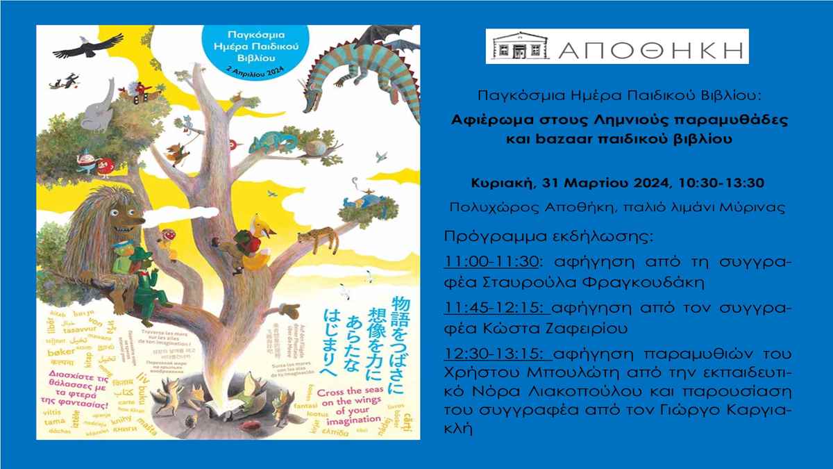 Ο Πολυχώρος Αποθήκη στο παλιό λιμάνι της Μύρινας, στο πλαίσιο της Παγκόσμιας Ημέρας Παιδικού Βιβλίου, που φέτος έχει ως μήνυμα ««Διασχίστε τις θάλασσες με τα φτερά της φαντασίας», διοργανώνει την Κυριακή 31 Μαρτίου, 10:30-13:30 εκδήλωση-αφιέρωμα στους Λημνιούς παραμυθάδες με μουσικο-θεατρικές αφηγήσεις και bazaar παιδικού βιβλίου.