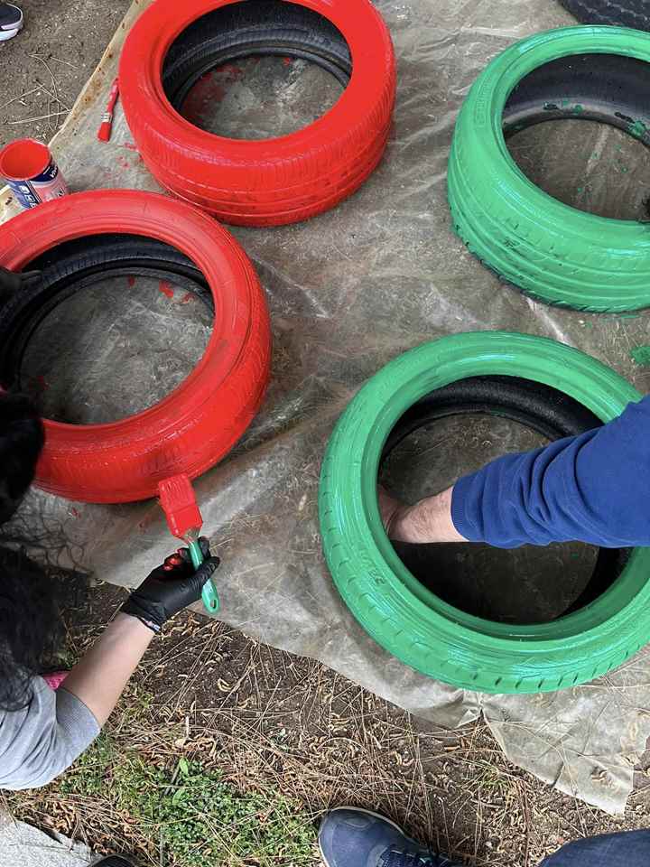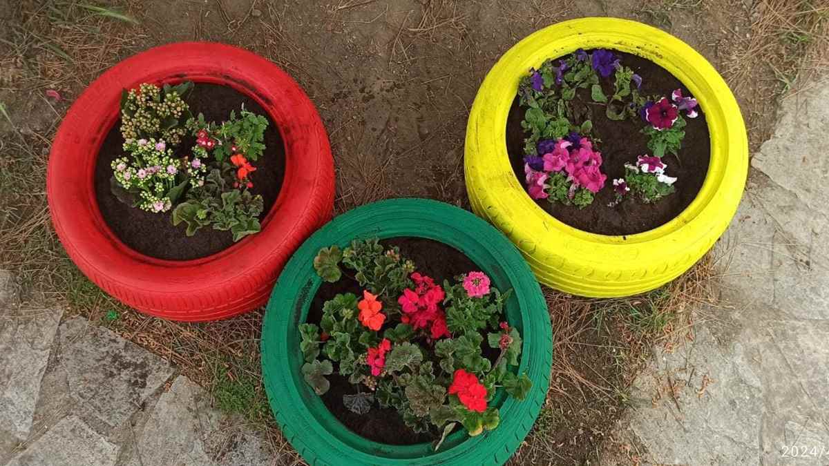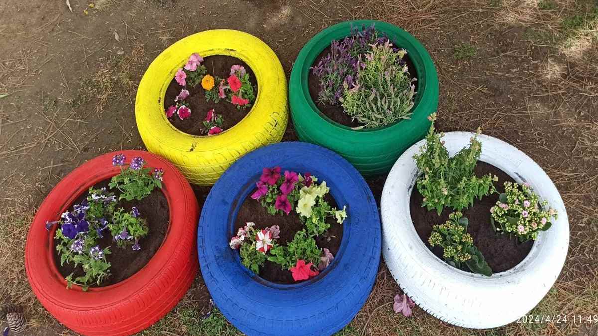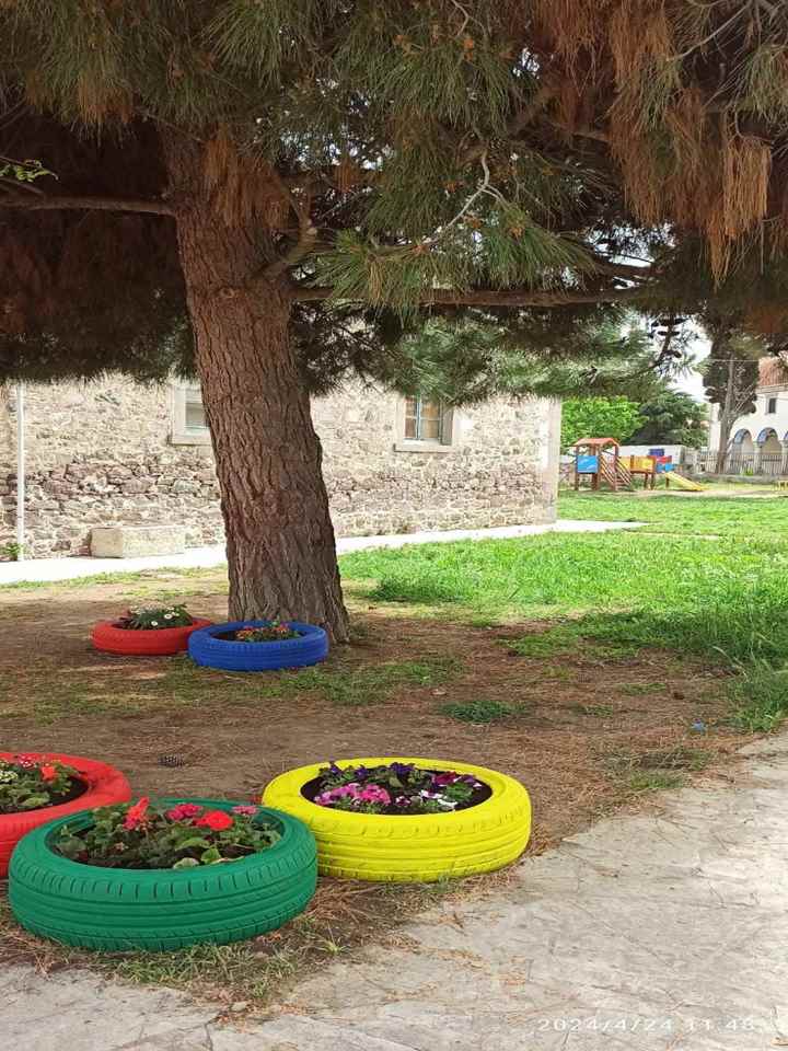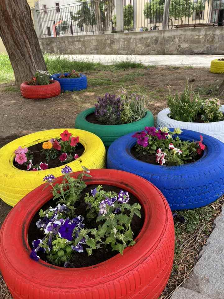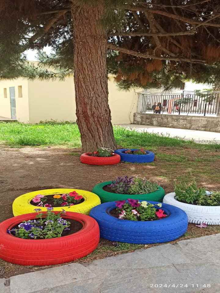 Χρησιμοποιώντας παλιά ελαστικά αυτοκινήτου, οι γονείς και οι εθελοντές του συλλόγου τα μετέτρεψαν σε πολύχρωμες γλάστρες, δίνοντας μια νέα ζωή στα ανακυκλώσιμα υλικά. Με την προσθήκη λουλουδιών, δημιουργήθηκαν μοναδικές γλάστρες που διακοσμούν πλέον την αυλή του σχολείου.