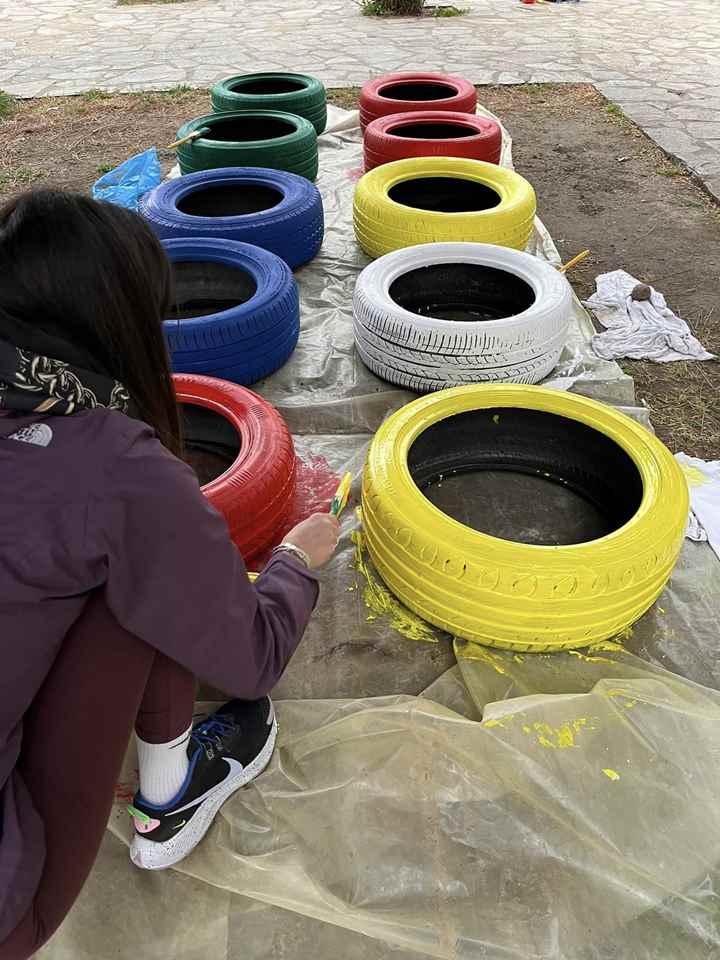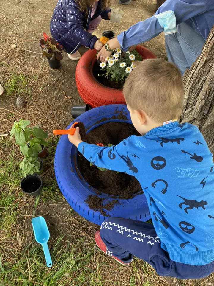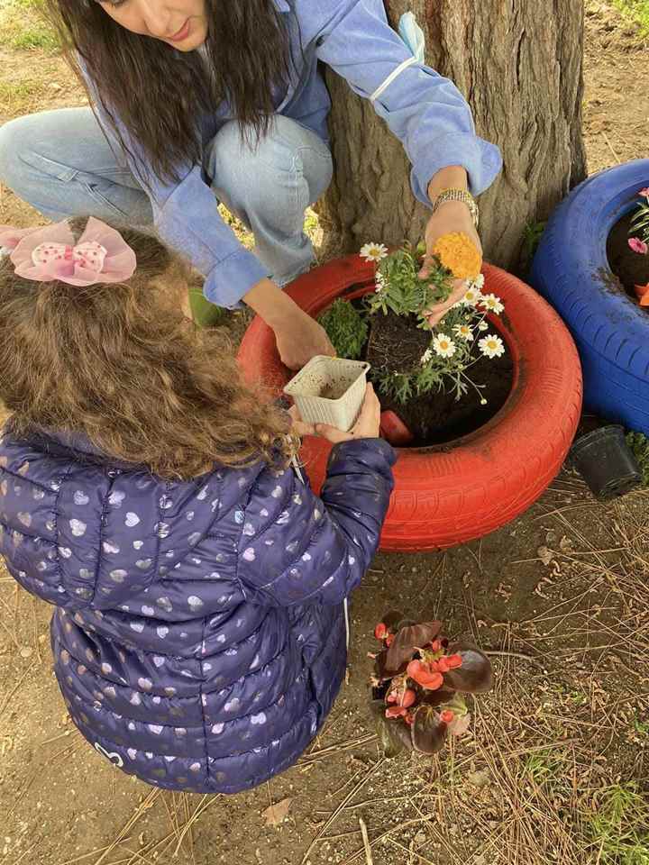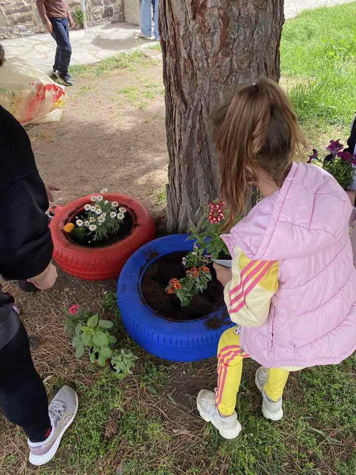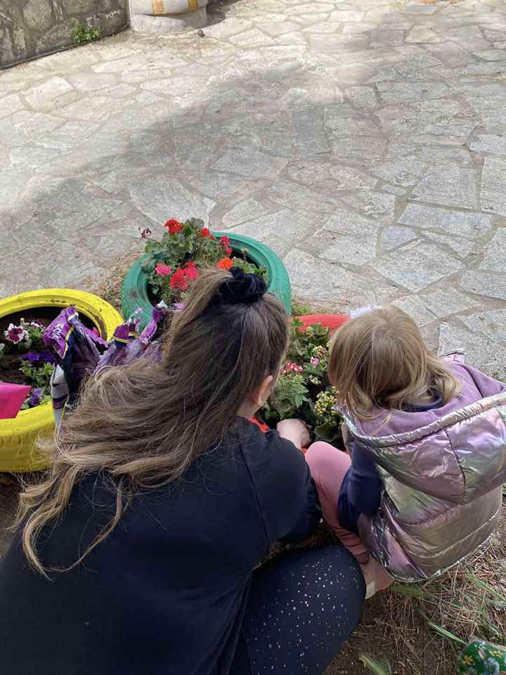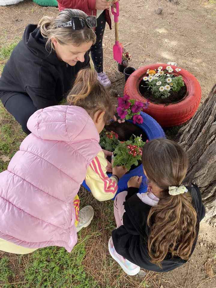 Χρησιμοποιώντας παλιά ελαστικά αυτοκινήτου, οι γονείς και οι εθελοντές του συλλόγου τα μετέτρεψαν σε πολύχρωμες γλάστρες, δίνοντας μια νέα ζωή στα ανακυκλώσιμα υλικά. Με την προσθήκη λουλουδιών, δημιουργήθηκαν μοναδικές γλάστρες που διακοσμούν πλέον την αυλή του σχολείου.