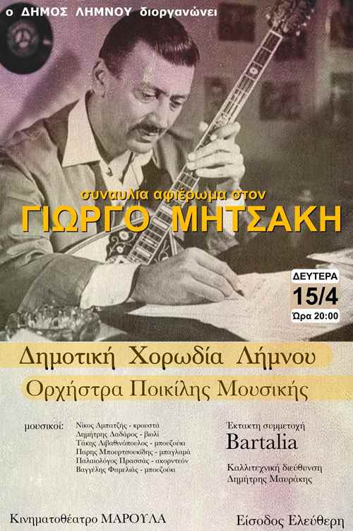 Η Δήμος Λήμνου διοργανώνει συναυλία – αφιέρωμα στον τραγουδοποιό και δεξιοτέχνη του μπουζουκιού Γιώργο Μητσάκη, με τη συμμετοχή της Δημοτικής Χορωδίας και της Ορχήστρας Ποικίλης Μουσικής, του συγκροτήματος κρουστών Bartalia και άλλους εκλεκτούς μουσικούς, σε καλλιτεχνική διεύθυνση του Δημήτρη Μαυράκη.