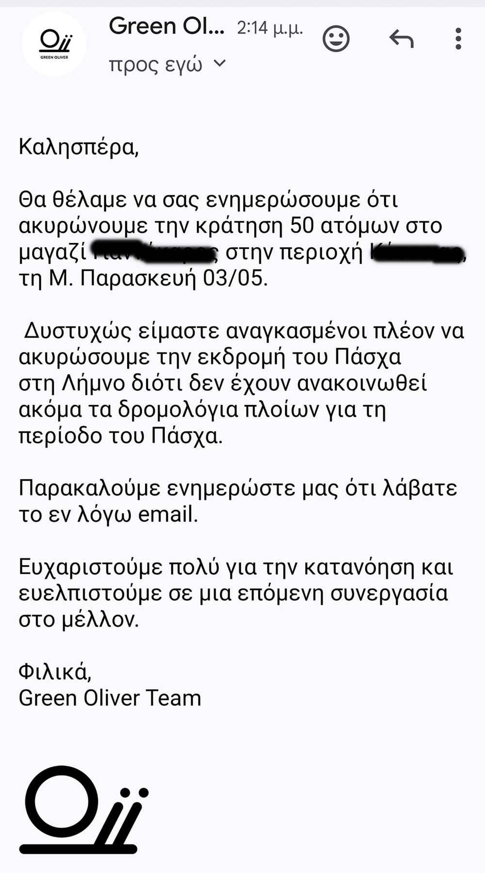 Τελικά, ο φόβος μας επιβεβαιώθηκε, με το πρακτορείο να αποστέλλει email ακυρώσεων κρατήσεων 50 ατόμων και να αναφέρει “ότι δυστυχώς είναι αναγκασμένοι να ακυρώσουν την εκδρομή του Πάσχα στη Λήμνο διότι δεν έχουν ακόμα ανακοινωθεί τα δρομολόγια πλοίων για την περίοδο του Πάσχα“.