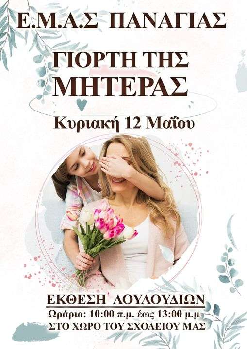 Ο Εκπολιτιστικός Μορφωτικός Αθλητικός Σύλλογος Παναγιάς σας καλεί στο ανθοστόλιστο στο χώρο του σχολείου, την Κυριακή 12 Μαΐου ημέρα της Γιορτής της Μητέρας.