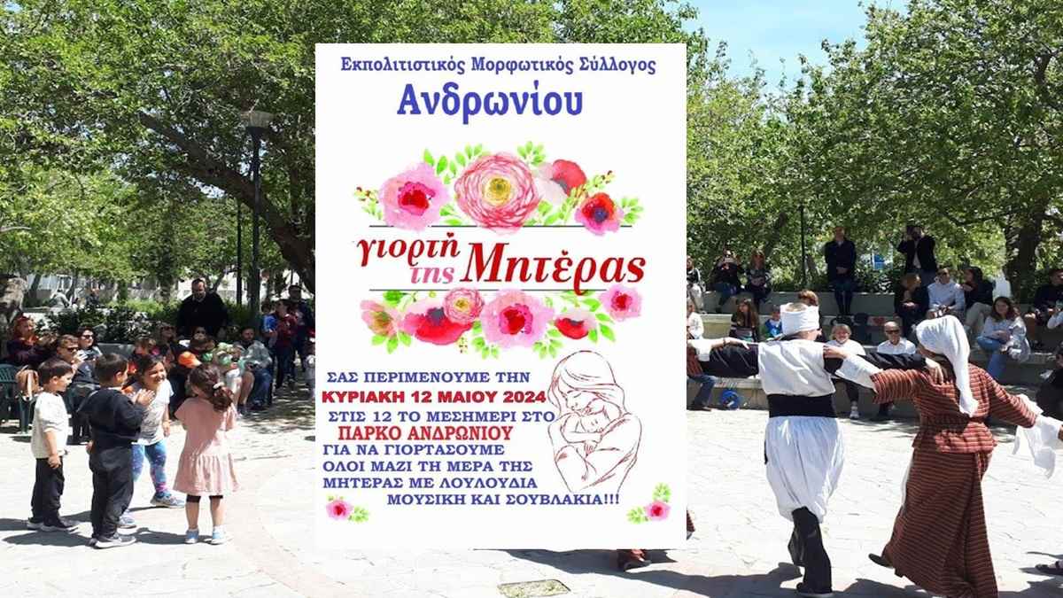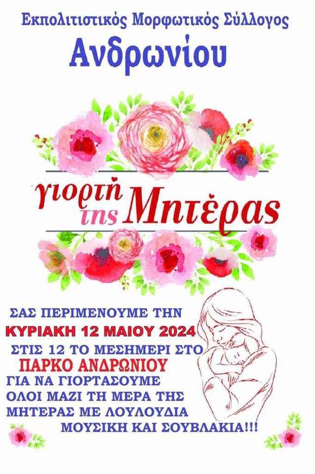 Την Κυριακή 12 Μαΐου στις 12.00 το μεσημέρι στο πάρκο Ανδρωνίου, ο Εκπολιτιστικός Μορφωτικός Σύλλογος γιορτάζει την “Γιορτή της Μητέρας” με λουλούδια μουσική και Σουβλάκια!