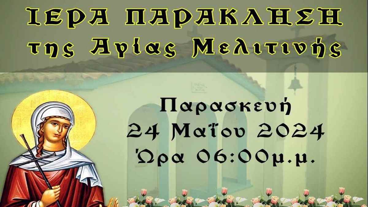 Σύμφωνα με ενημέρωση του Πατέρα Γεώργιου Κουντούρη, η προγραμματισμένη παράκληση της Αγίας Μελιτινής θα γίνει την Παρασκευή 24 Μαϊου και ώρα 6:00 μ.μ. αντί του εξωκκλησιου της Αγίας στον ιερό ναό Αγίου Γεωργίου Καλλιθέας για διευκόλυνση των ευλαβών προσκυνητών!!