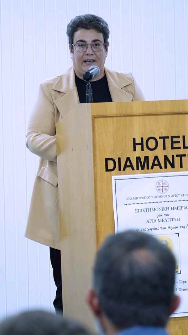 Η τρίτη εισηγήτρια, κ. Κυριακούλα Παπαδημητρίου, καθηγήτρια Καινής Διαθήκης του Τμήματος Κοινωνικής Θεολογίας και Χριστιανικού Πολιτισμού του Α.Π.Θ., είχε ως θέμα «Η παρουσία της Αγίας Μελιτινής στη Λήμνο». Με βάση αγιολογικές και ιστορικές πηγές παρουσίασε τα δεδομένα στοιχεία της ζωής και του μαρτυρίου της Αγίας Μελιτινής και αναφέρθηκε στις τοπικές παραδόσεις του νησιού μας σχετικά με τον ενταφιασμό της μάρτυρος εδώ.
