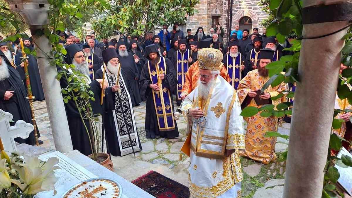 Το Σάββατο 19 Μαΐου ο Σεπτός Ποιμενάρχης μας τέλεσε την Θεία Λειτουργία στο Καθολικό της Ιεράς Μονής Κουτλουμουσίου, συλλειτουργούντος του Σεβ. Μητροπολίτου Ίμβρου και Τενέδου κ. Κυρίλλου, Καθηγουμένων άλλων Ιερών Μονών και πλήθους Ιερομονάχων και Διακόνων. Ακολούθησε το ετήσιο ιερό μνημόσυνο του αοιδίμου Γέροντος Χριστοδούλου, σύμφωνα προς το Μοναχικό τυπικό, με την συμπροσευχητική παρουσία των Πανοσιολ. Καθηγουμένων των Ιερών Μονών Βατοπαιδίου κ. Εφραίμ, Ιβήρων κ. Ναθαναήλ και Κουτλουμουσίου κ. Νικολάου. Συνέχεια του ιερού μνημοσύνου ήταν η μοναστηριακή τράπεζα, όπου παρακάθησαν πολλοί άλλοι φιλοξενούμενοι κληρικοί και πλήθος προσκυνητών, μαζί με όλα τα Μέλη της Αδελφότητος, οι οποίοι με την αθρόα συμμετοχή τους εκδήλωσαν τον σεβασμό τους στην αγιορειτική φυσιογνωμία και στην μεγάλη εκκλησιαστική προσωπικότητα του αειμνήστου Γέροντος Χριστοδούλου, για τον οποίο μίλησαν με ιερή συγκίνηση και αλησμόνητες εμπειρίες ο Σεβ. Ιμβρου κ. Κύριλλος και οι Καθηγούμενοι Κουτλουμουσίου και Βατοπαιδίου. Την ευχαριστιακή σύναξη έκλεισε ο Σεβ. κ. Ιερόθεος, κατόπιν προτροπής του οικείου Καθηγουμένου απήυθυνε προς πάντας λόγον πνευματικής οικοδομής για την αναστάσιμη ζωή και προσδοκία.