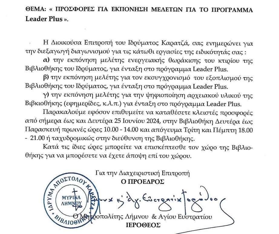 Η Διοικούσα Επιτροπή του Ιδρύματος Καρατζά, ενημερώνει για την διεξαγωγή διαγωνισμού προσφορών για την εκπόνηση μελετών προγράμματος leader για την βιβλιοθήκη