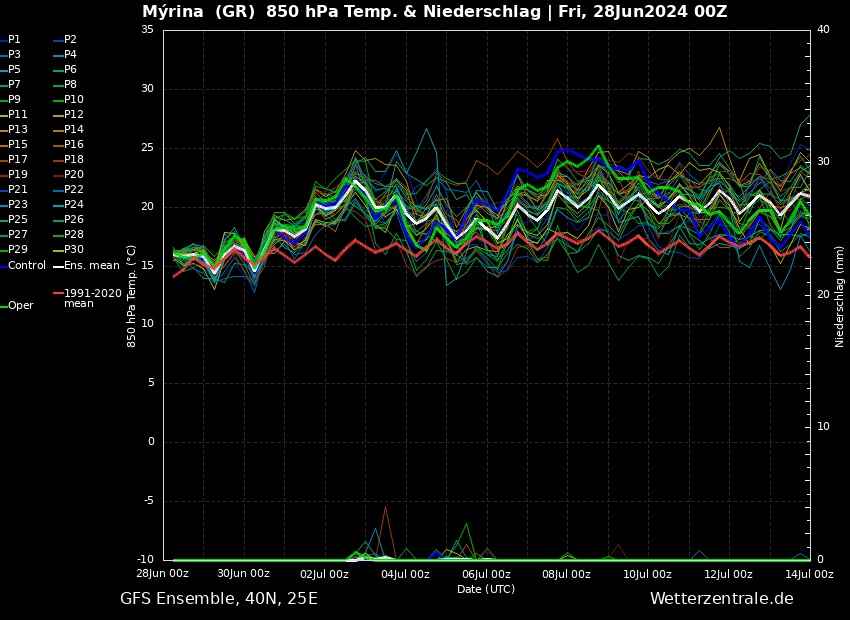 Παρακάτω διάγραμμα τάσης καιρού θερμοκρασίας και βροχοπτώσεων.Η θερμοκρασία είναι οι καμπύλες στην μέση του πίνακα που δείχνουν τα καιρικά σενάρια για την θερμοκρασία στα 850hpa (είναι στα 1500μ όπου μετράμε ως βάση την θερμοκρασία στην ατμόσφαιρα και απλά προσθέτουμε 12 βαθμούς). Η κόκκινη γραμμή δείχνει τον μέσο όρο θερμοκρασίας των 30 τελευταίων ετών.Στο κάτω μέρος στη βάση του πίνακα είναι οι βροχοπτώσεις και η άσπρη καμπύλη είναι ο μέσος όρος από 30 καιρικά σενάρια.