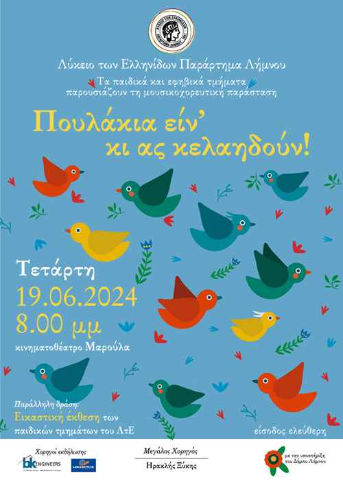 Το Λύκειον των Ελληνίδων Λήμνου σας προσκαλεί στην μουσικοχορευτική παράσταση “Πουλάκια ειν’ κι ας κελαηδούν” που θα πραγματοποιηθεί την Τετάρτη 19 Ιουνίου 2024, στις 8.00μμ.