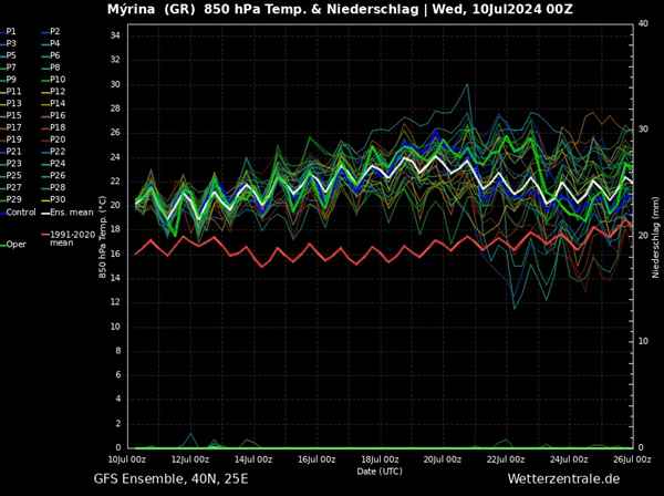 Η θερμοκρασία είναι οι καμπύλες στην μέση του πίνακα που δείχνουν τα καιρικά σενάρια για την θερμοκρασία στα 850hpa(είναι στα 1500μ όπου μετράμε ως βάση την θερμοκρασία στην ατμόσφαιρα και απλά προσθέτουμε 15 βαθμούς).Η κόκκινη γραμμή δείχνει τον μέσο όρο θερμοκρασίας των 30 τελευταίων ετών.Στο κάτω μέρος στη βάση του πίνακα είναι οι βροχοπτώσεις και η άσπρη καμπύλη είναι ο μέσος όρος από 30 καιρικά σενάρια.