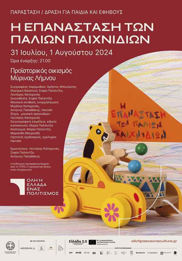 Το Υπουργείο Πολιτισμού στο πλαίσιο του πολιτιστικού θεσμού «Όλη η Ελλάδα ένας Πολιτισμός»…ανακοινώνει τη θεατρική παράσταση «Η επανάσταση των παλιών παιχνιδιών..», που αποτελεί μια ελεύθερη θεατρική διασκευή, βασισμένη στο ομότιτλο παραμύθι του γνωστού Λημνιού αρχαιολόγου Χρήστου Μπουλώτη και παρουσιάζεται μέσα από τη σκηνοθετική ματιά της Σοφίας Παλάντζα.