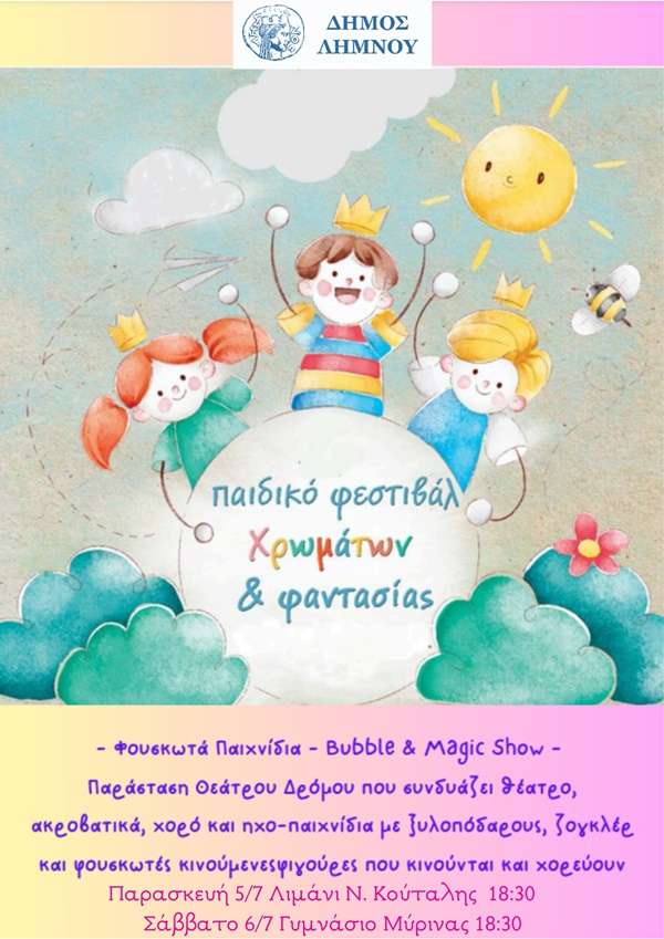 Ο Δήμος Λήμνου διοργανώνει το «Παιδικό Φεστιβάλ Χρωμάτων και Φαντασίας» την Παρασκευή 5 Ιουλίου στο λιμάνι της Νέας Κούταλης και το Σάββατο 6 Ιουλίου στο Γυμνάσιο Μύρινας.