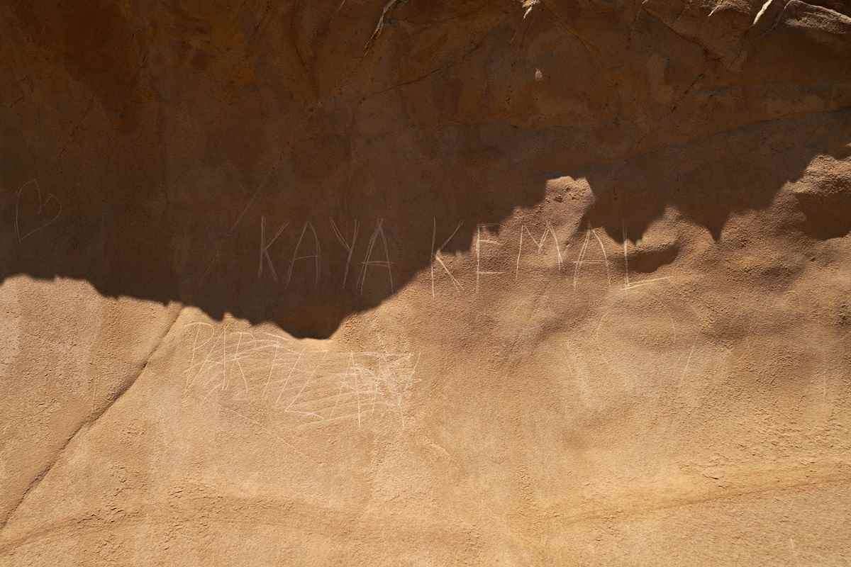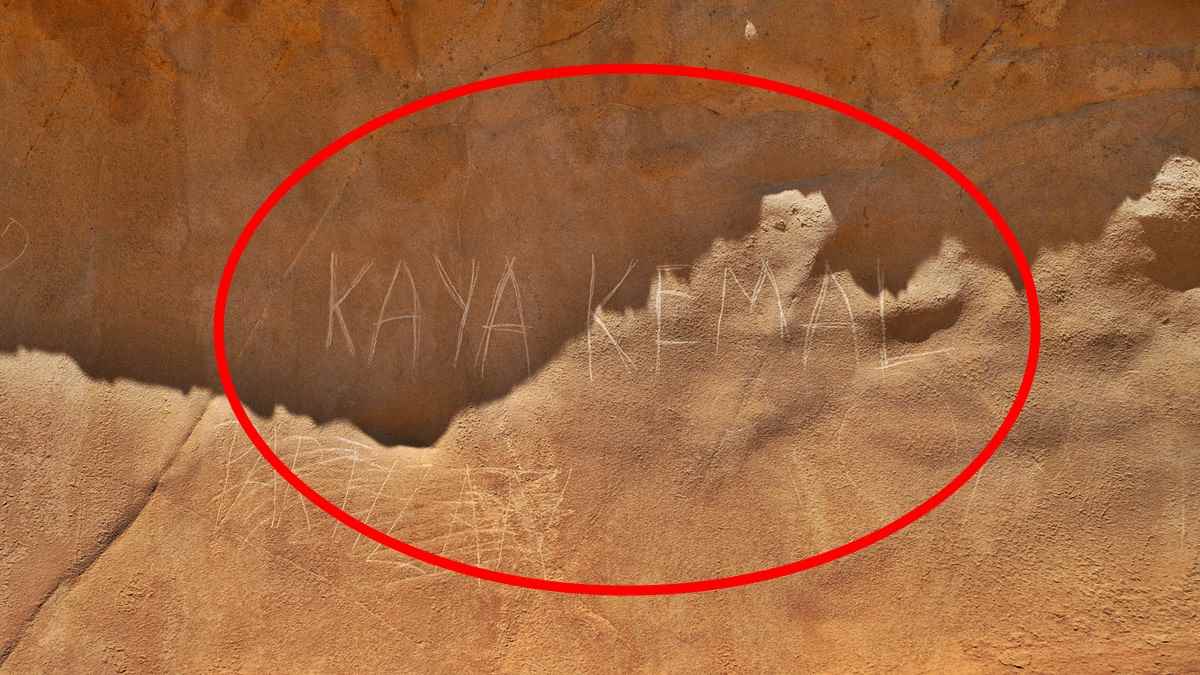 Εκτός από τον βανδαλισμό των πολλών πετρωμάτων με διάφορα σύμβολα και ονόματα χαραγμένα, οργή προκαλεί και ένα συγκεκριμένο εκτός από όλα τα άλλα. Παρατηρώντας καλά τις φωτογραφίες που ανάρτησε στον λογαριασμό του στο facebook θα δείτε ότι σε ένα από τα πετρώματα έχουν χαράξει το όνομα του Τούρκου Οθωμανού Kaya Kemal