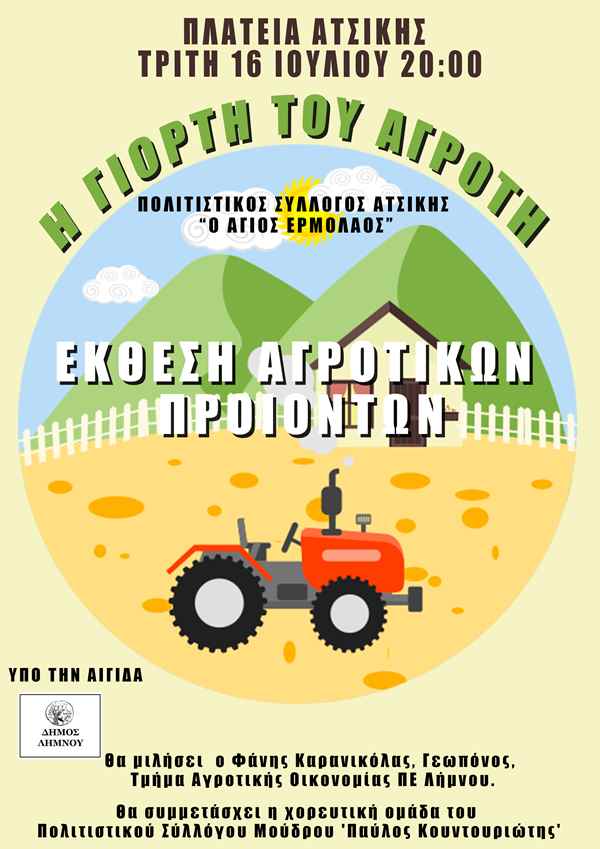 Την εκδήλωση διοργανώνει ο Πολιτιστικός Σύλλογος Ατσικής “Ο Άγιος Ερμόλαος” και είναι αφιερωμένη στον Λημνιό αγρότη, και την προσφορά του στον αγροτικό τομέα και την παραγωγή αγροτικών προϊόντων.