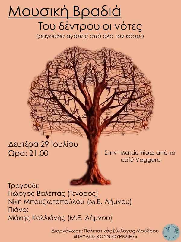 Ο Πολιτιστικός Σύλλογος Μούδρου «Παύλος Κουντρουριώτης» διοργανώνει μία μουσική βραδιά, στην πλατεία, κάτω από το δέντρο.
