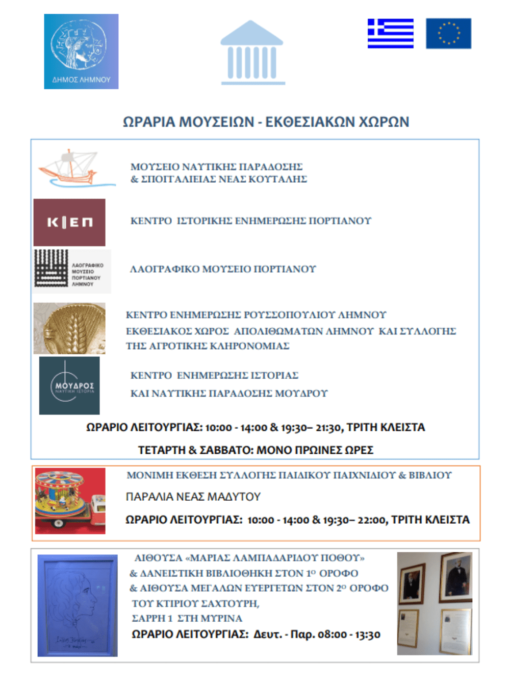 Με ενημέρωση ο Δήμος Λήμνου γνωρίζει ότι την Πέμπτη 15 Αυγούστου, ημέρα της εορτής της Κοιμήσεως της Θεοτόκου, τα μουσεία του Δήμου Λήμνου θα παραμείνουν κλειστά.